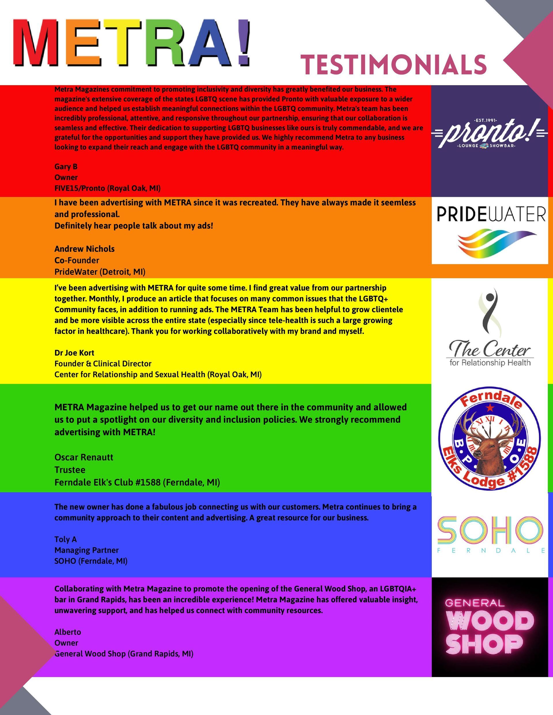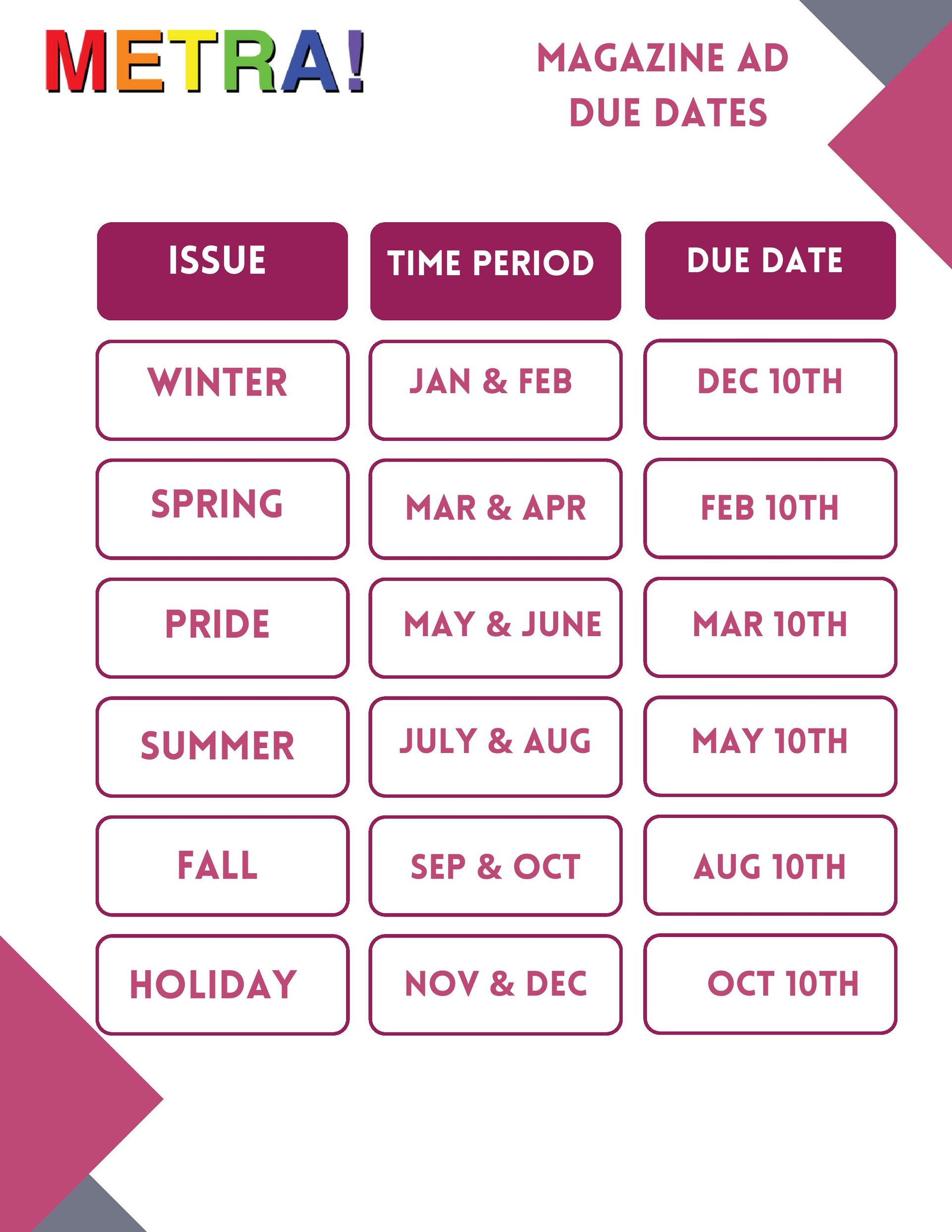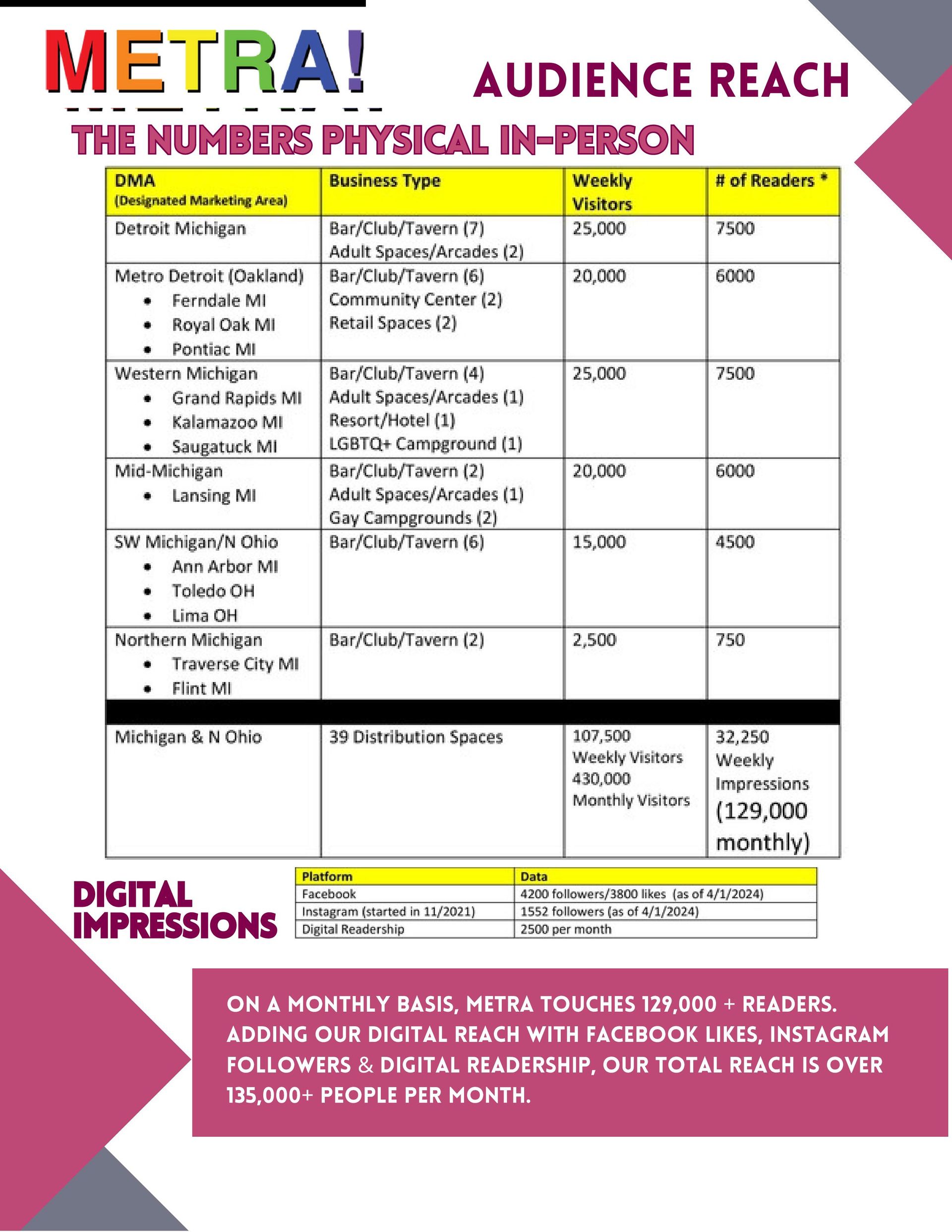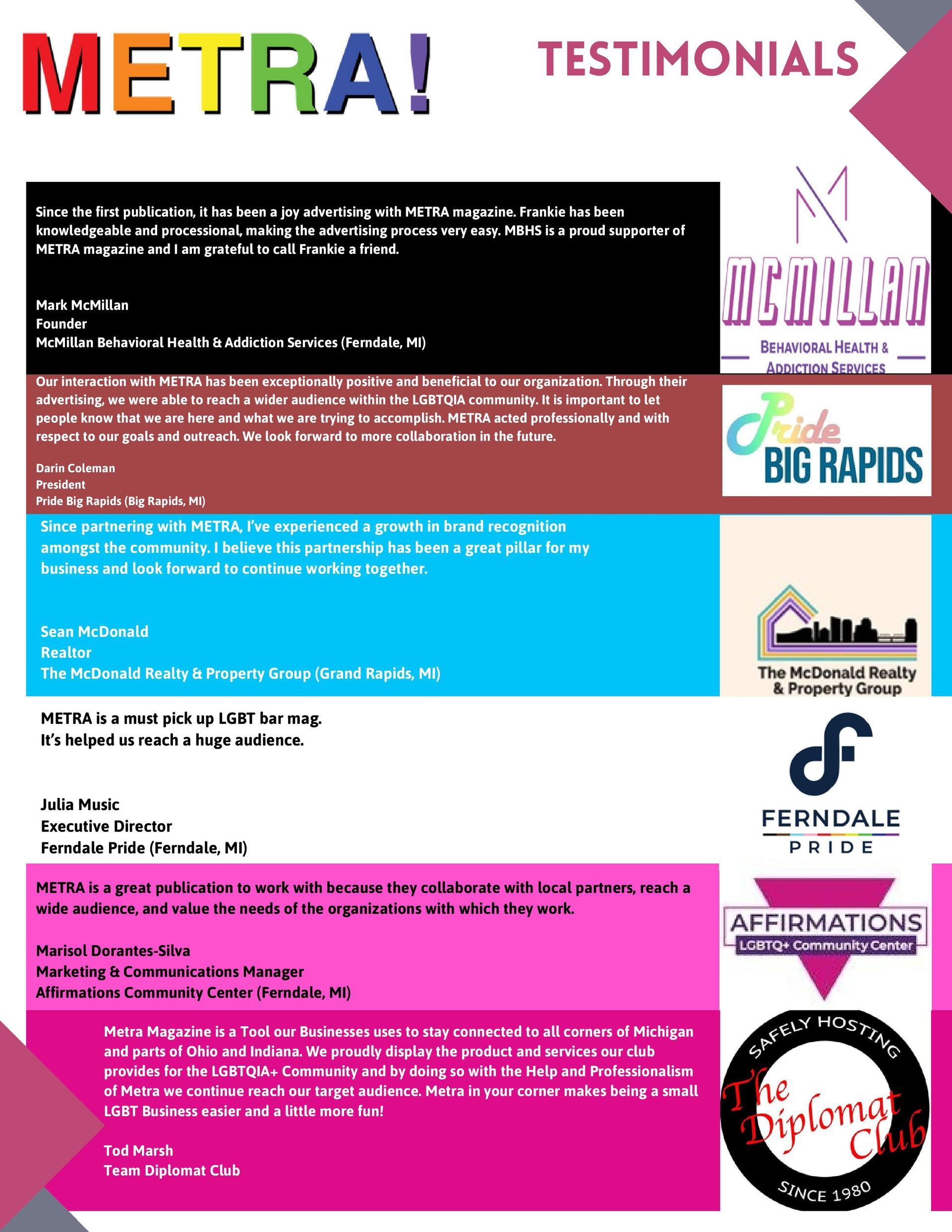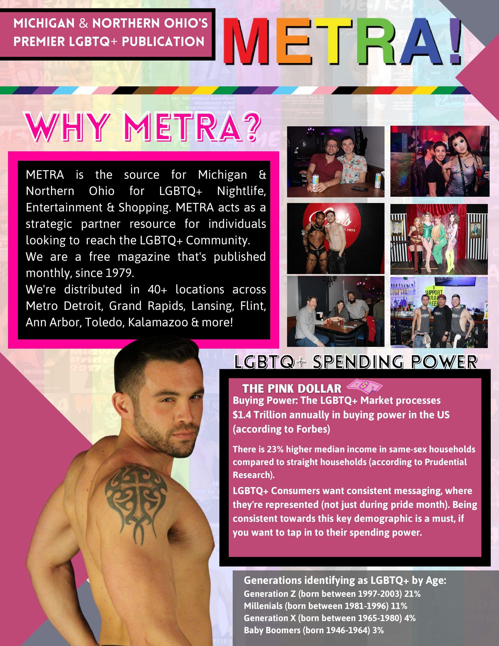 METRA has been serving the LGBTQ+ Community for 4+ decades. We've been instrumental with navigating our community to support businesses that are like minded and LGBTQ+ friendly. Want to learn more about advertising with METRA?