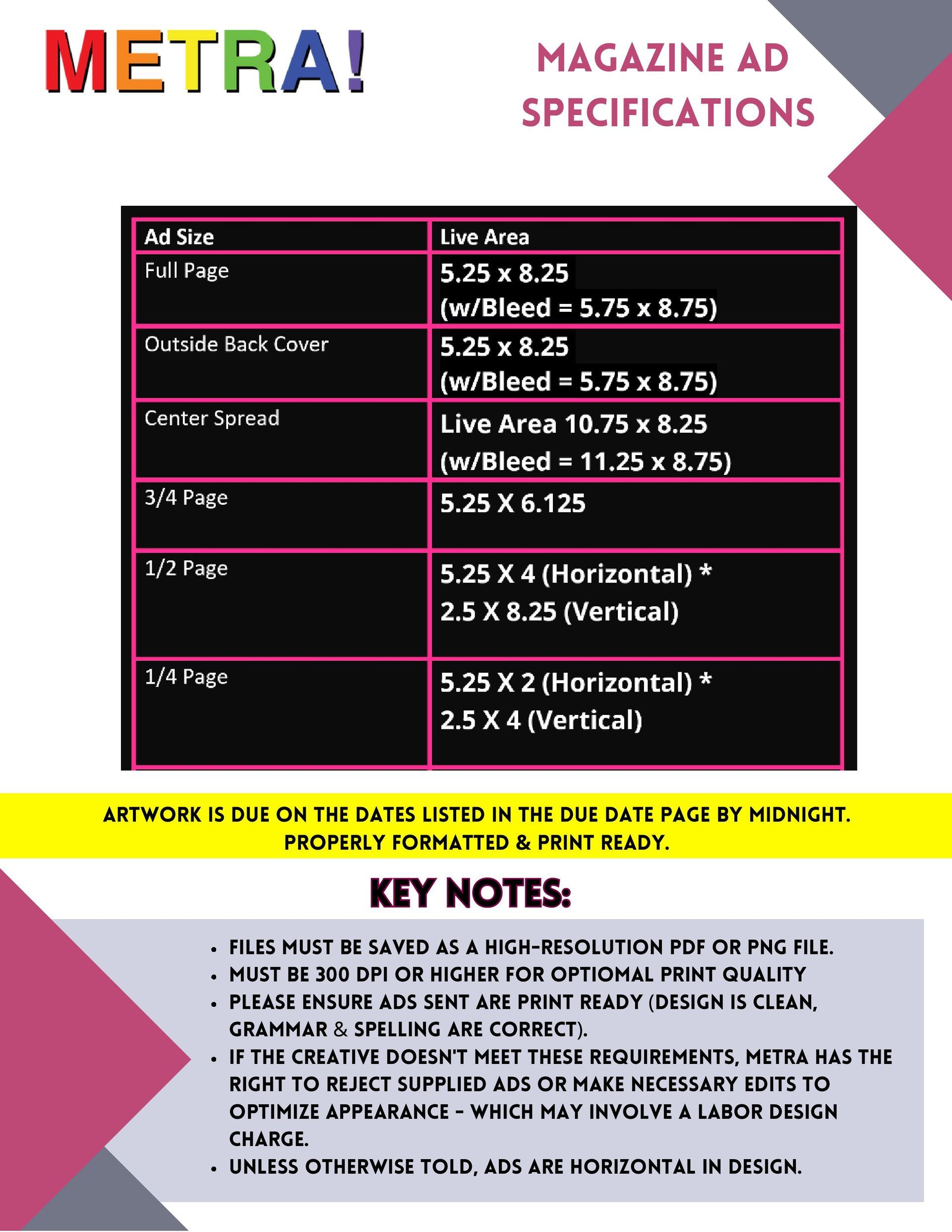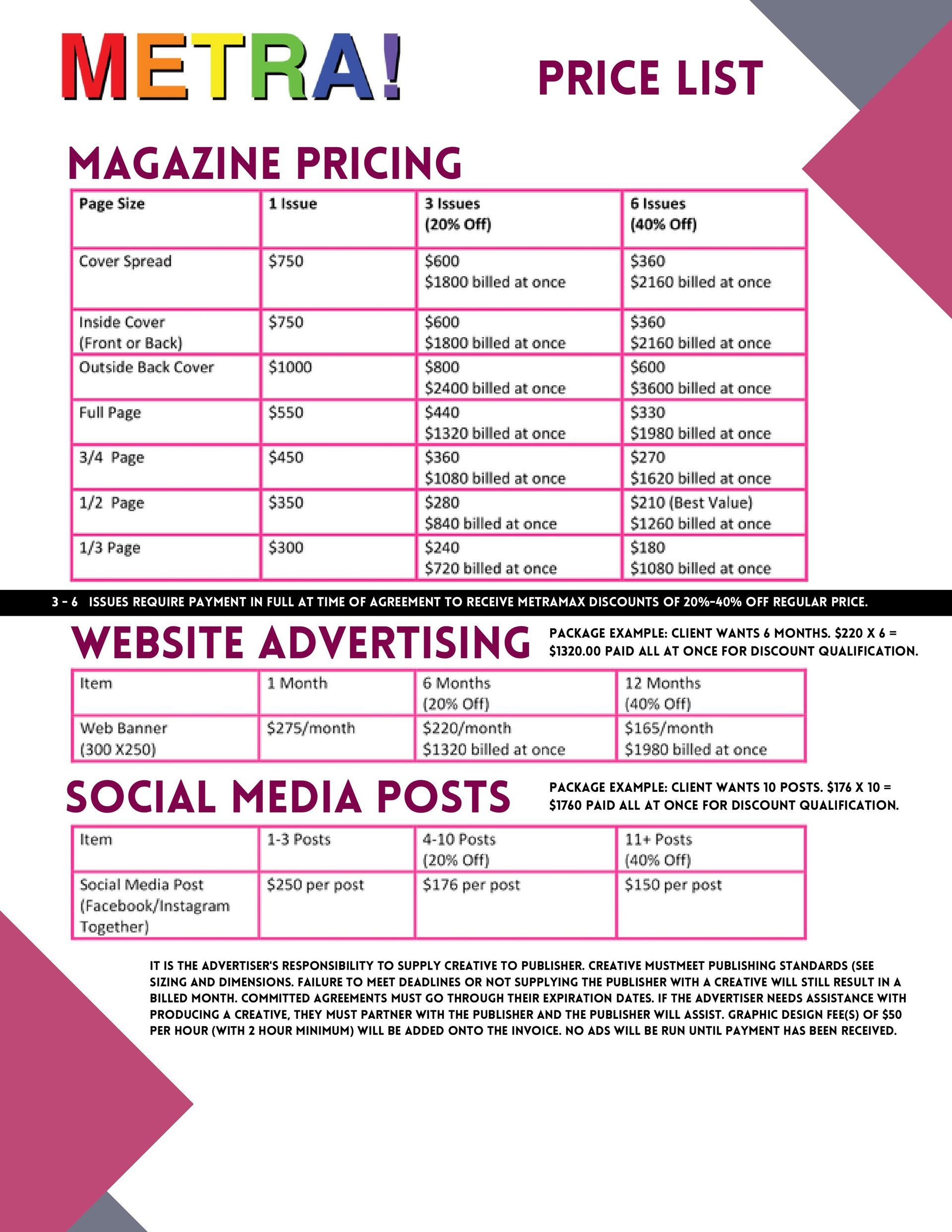 All of the information that you need is below. If you'd like to schedule a call to discuss out loud, feel free to email info@metramagazine.com
